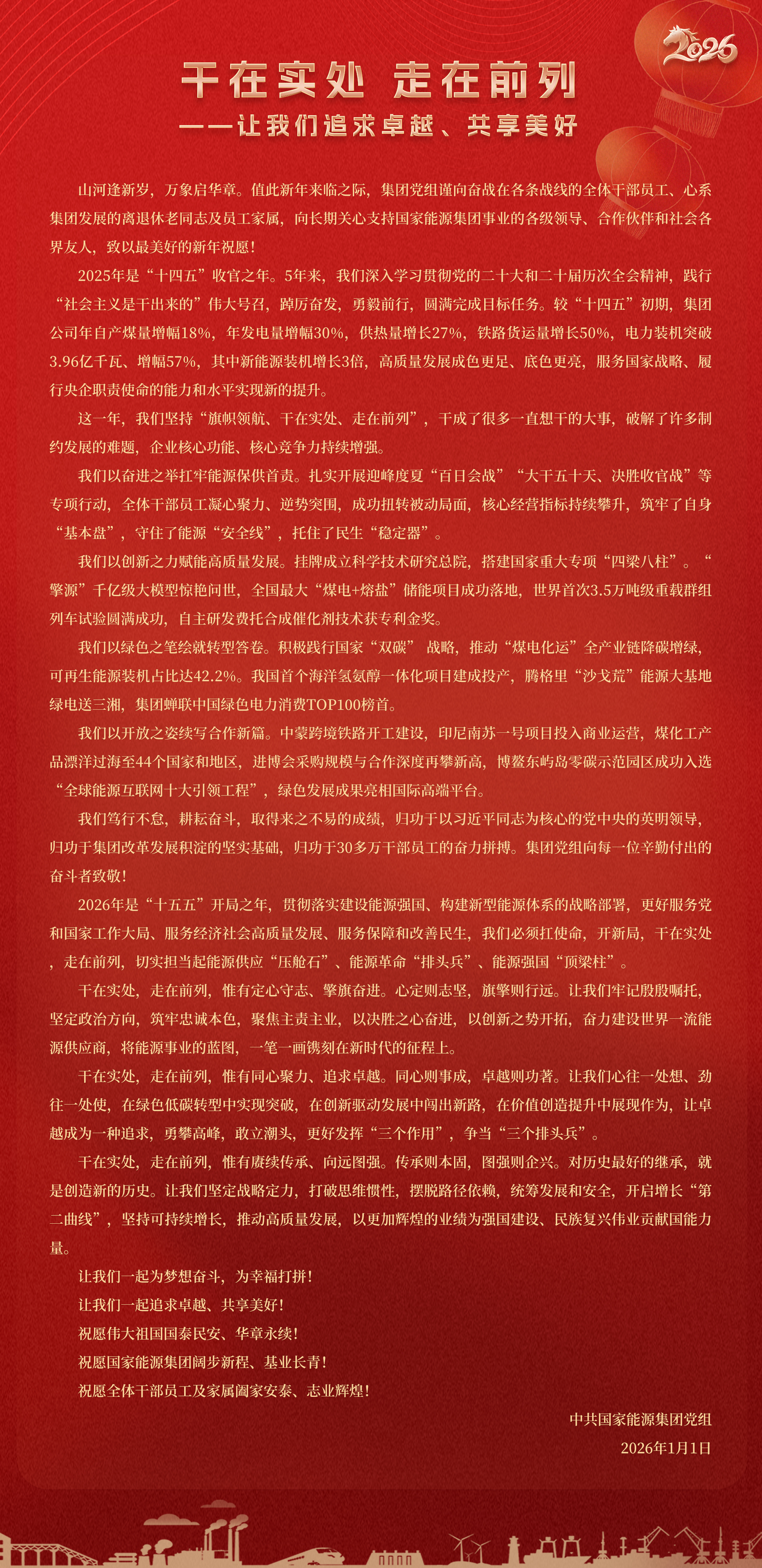 國家能源集團胸懷“國之大者”,增產增供、穩(wěn)價穩(wěn)市,積極服從服務國家戰(zhàn)略、保障國家能源安全、助力國民經濟穩(wěn)增長,推動煤炭安全綠色智能、煤電清潔高效穩(wěn)定、現代煤化工高端多元低碳、運輸物流協同一體、新能源多元創(chuàng)新規(guī)模化發(fā)展,全力擔當能源強國頂梁柱,能源供應壓艙石,能源革命排頭兵。